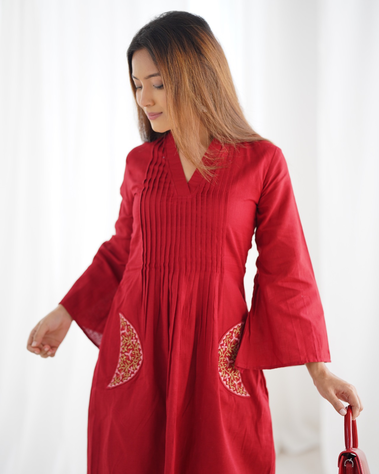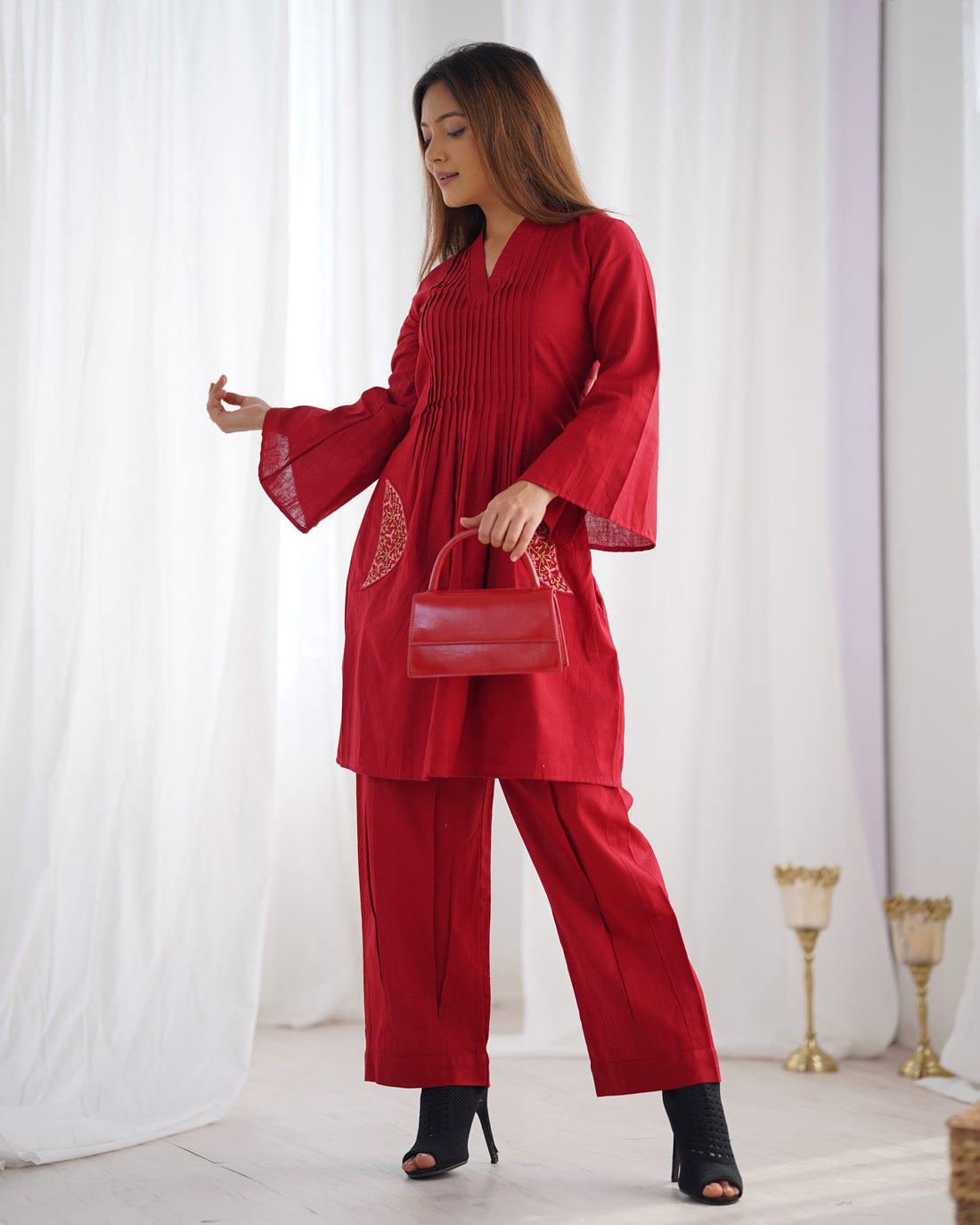 Crafted from soft fabric for comfort and style. The straight-cut silhouette is enhanced by finely pleated detailing at the neckline and the standout feature of embroidered pockets, adding a chic touch. Perfect for both casual outings and festive occasions, this ensemble exudes elegance with minimal effort.
